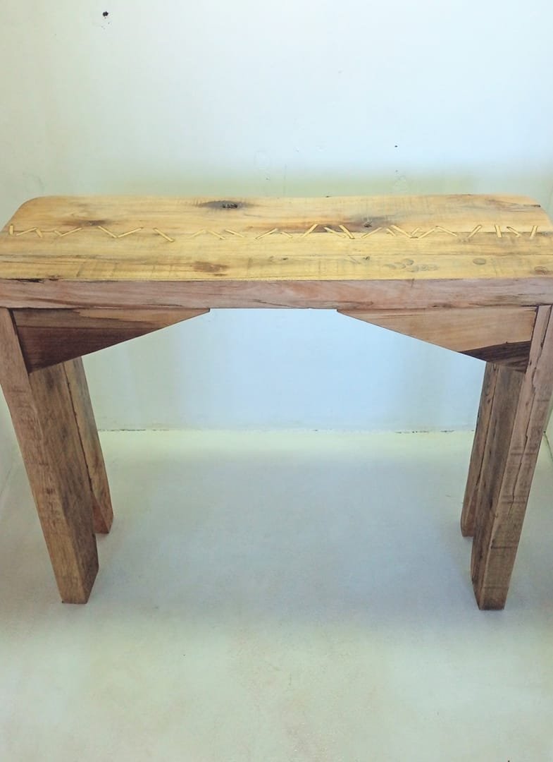 Frankie es una mesa de arrime ATESANAL elaborada con madera maciza de saligna bruta, resaltando su carácter Rústico donde cada imperfección, cuenta una historia. Las tablas fueron recuperadas de un antiguo encofrado de obra y se conservaron sus detalles originales, respetando la memoria marcada del material.